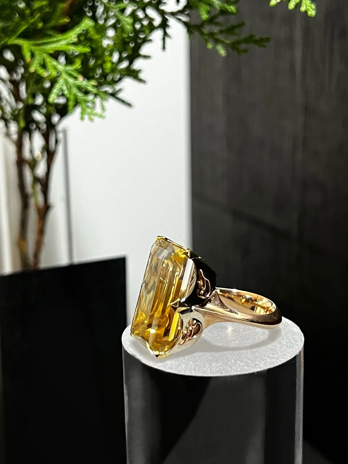 Australian pear shaped Zircon (4.42ct) and two square shaped yellow sapphires (0.50ct) armoured in 18k white, yellow and rose gold ring. $8,200.00 SOLD
