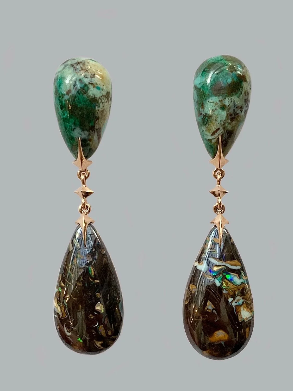 Boulder Opals (16.14ct) from Winton, Central QLD armoured in 18k white, yellow and rose gold earrings. $9,800.00 SOLD