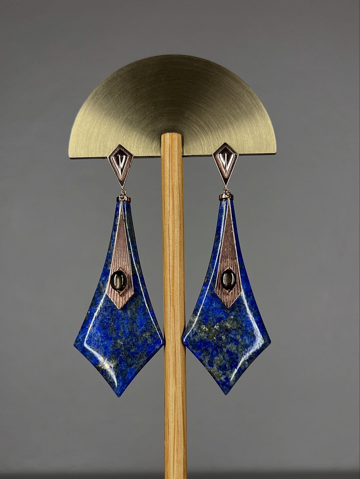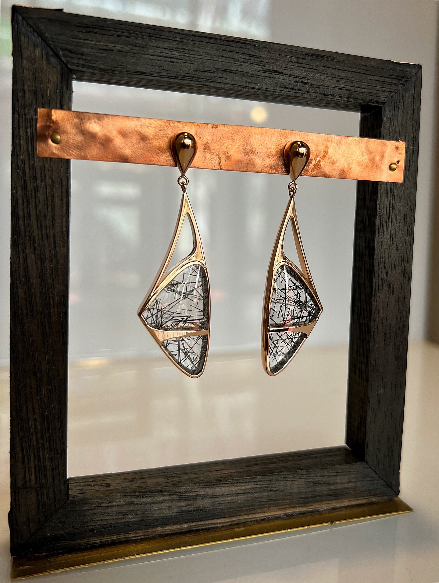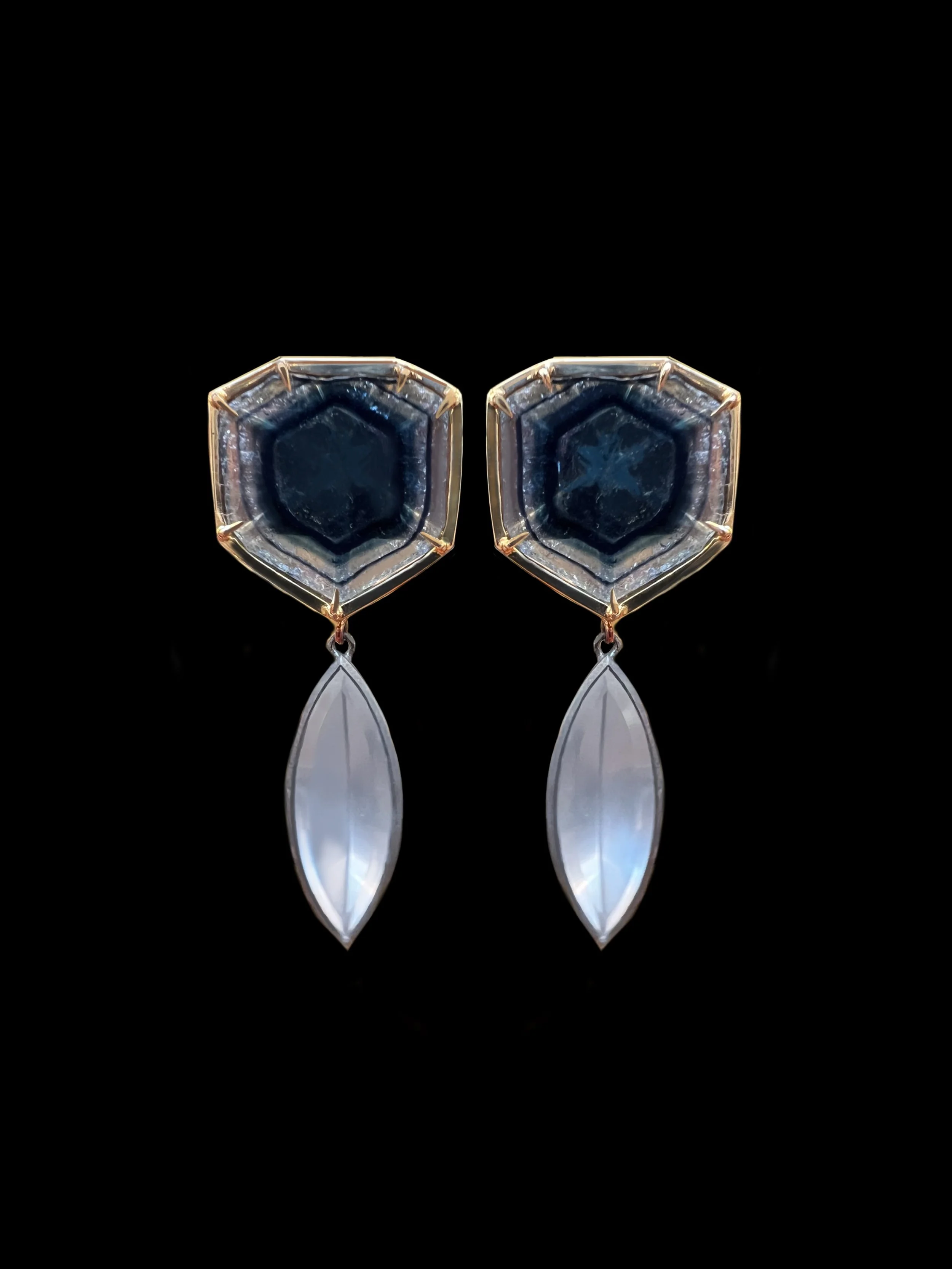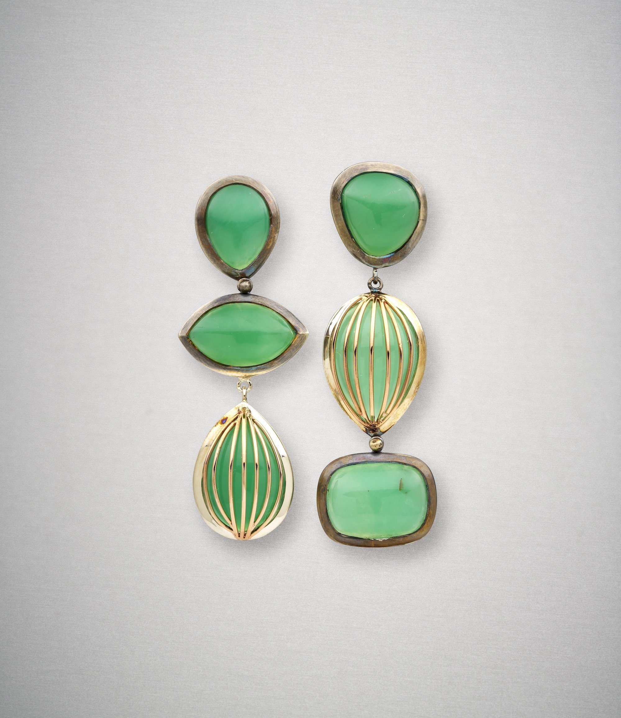 โBreath of Mauriโ Earrings : Carved Turkish Chalcedony (15.51ct) in oxidised silver and 9k rose gold. SOLD $7900 2024