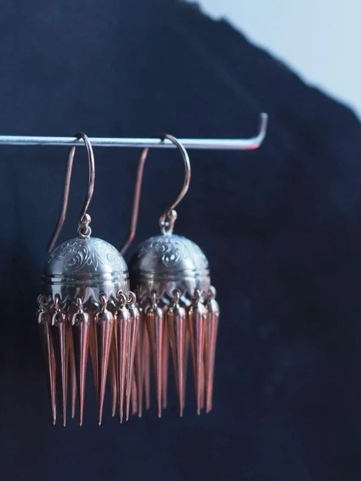 Precious Droplet earrings: Turquoise from Amaroo, Western Australia 15.58ct armoured in oxidised silver and 9k rose gold ‘fern’ studs. SOLD $3,900.00 2025